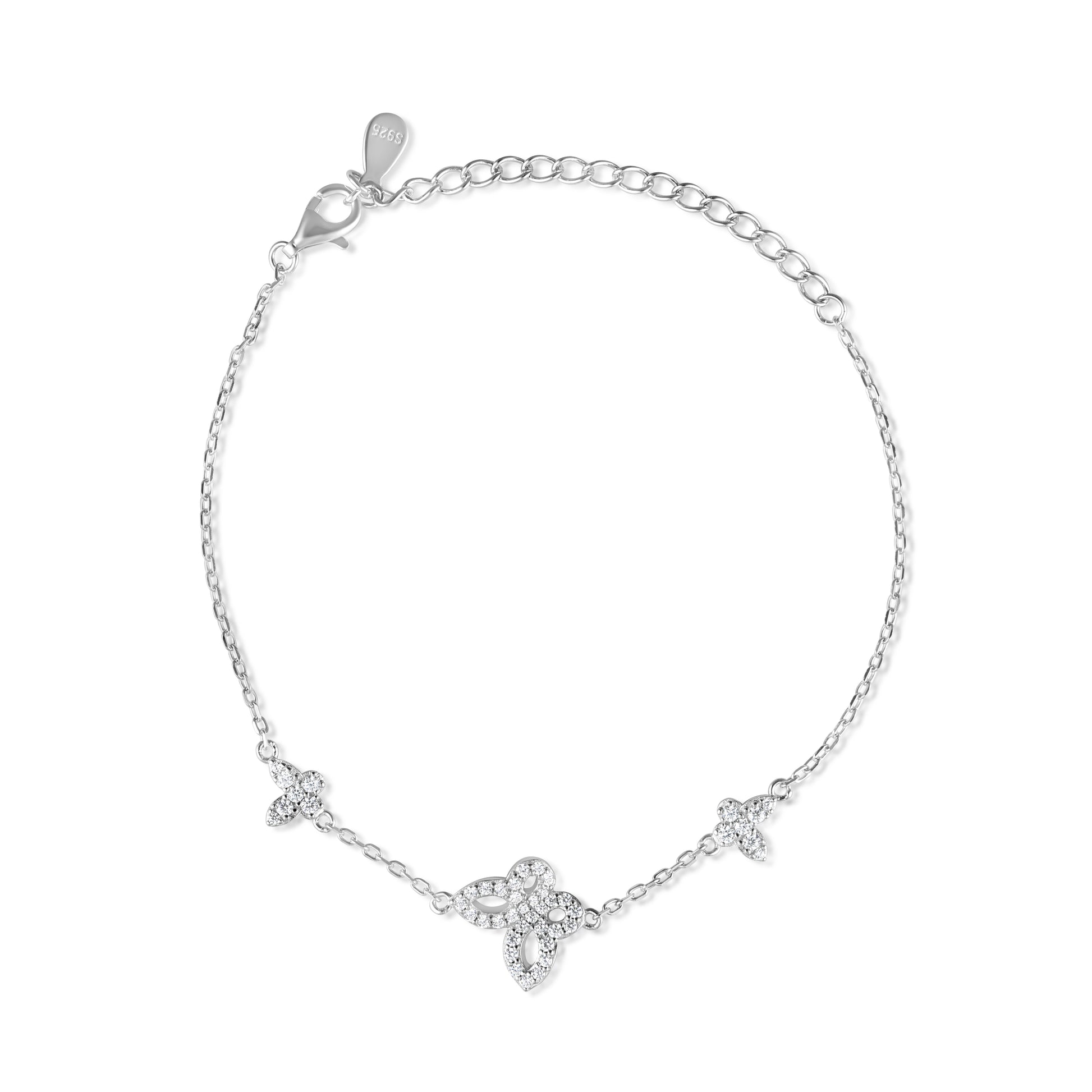 צמיד כסף מעודן, המשלב תליוני פרפרים מעוצבים עם אבנים מבריקות הצמודות אליהם. כל פרפר מצופה באבנים נוצצות, שמוסיפות ברק וקסם לתכשיט. העיצוב הייחודי מעניק לצמיד מראה עדין ומרשים, המשלב טבע ויופי בצורה אלגנטית. הצמיד אידיאלי להוספת נופך של זוהר ותחכום לכל הופעה.