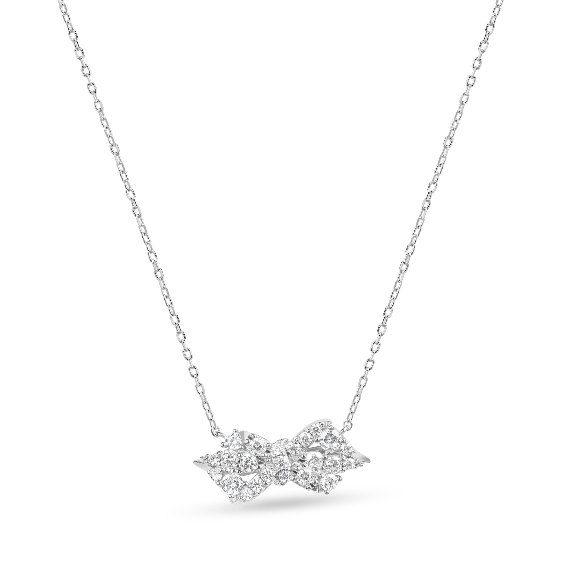 שרשרת כסף עדינה עם תליון פפיון מעוצב, משובץ באבני זירקון מנצנצות. העיצוב הקלאסי והאלגנטי מעניק לתכשיט נופך של רוך ויוקרה, בעוד שהאבנים המנצנצות מוסיפות לו ברק מיוחד. .תכשיט שמסמל תחכום, נשיות וסטייל רומנטי