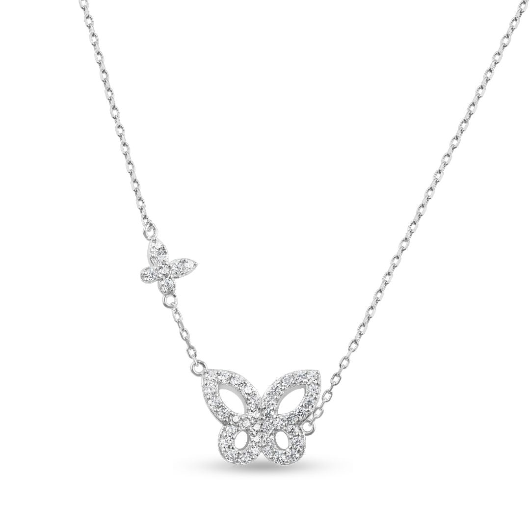 שרשרת כסף עם תליון בעיצוב שני פרפרים, אחד גדול ואחד קטן, המשובצים באבני זירקון מנצנצות. העיצוב המשולב מביא תחושת תנועה קלילה ורומנטית, כשהפרפרים מסמלים חופש ויופי. תכשיט שמוסיף נופך של אלגנטיות וזוהר לכל רגע מיוחד.